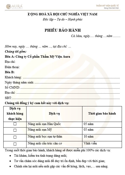 Chính sách bảo hành quyền lợi của khách hàng khi sử dụng dịch vụ tại Thẩm mỹ viện Quốc tế Aura được thể hiện qua văn bản bảo hành trọn đời như sau: