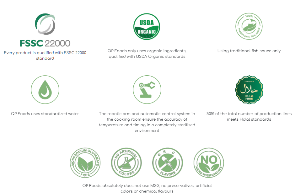 Tự hào có tất cả các dòng sản phẩm đạt Tiêu chuẩn FSSC 22000, QP Foods hướng đến xây dựng một hệ sinh thái công nghiệp chế biến thực phẩm từ tài nguyên bản địa và văn hóa ẩm thực Việt Nam, nhằm nâng cao chuỗi giá trị nông sản Việt với những thương hiệu dẫn dắt thị trường thực phẩm toàn cầu.